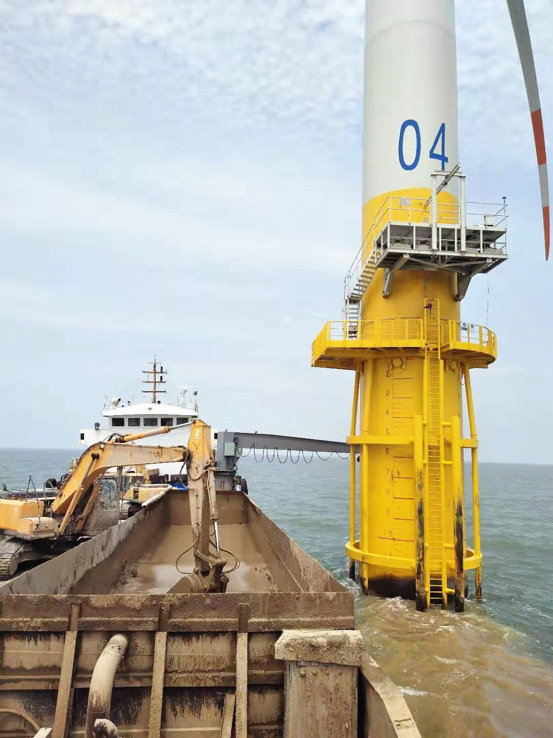 该项目是中电投大丰H3#300MW海上风电项目风电场,位于江苏省盐城市,为近海风电场工程。据2019年1月现场扫测图和澄清文件中现场扫测图显示,风场单桩基础建成后,桩基受冲刷形成较深坑洼,严重影响风电场的安全运营,需在风场正常运营下进行防冲刷保护。
