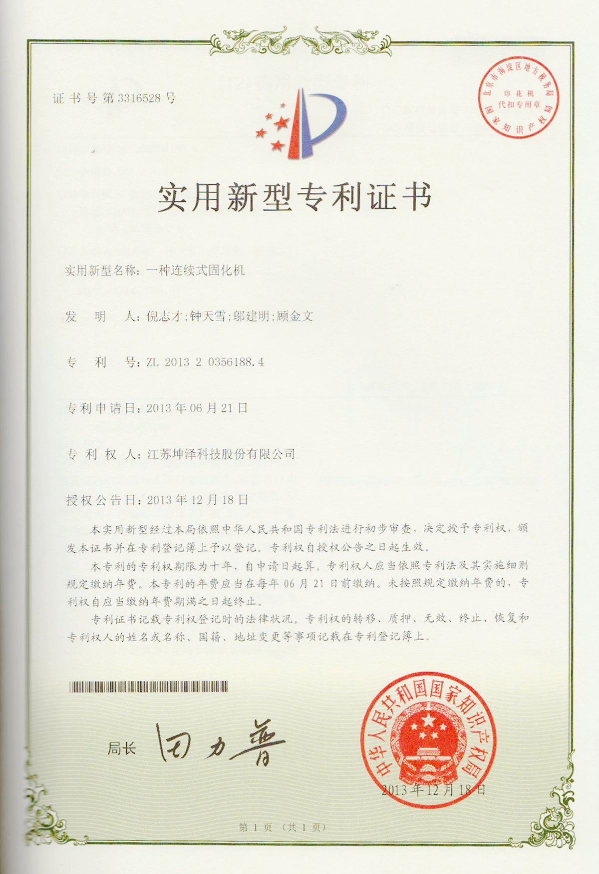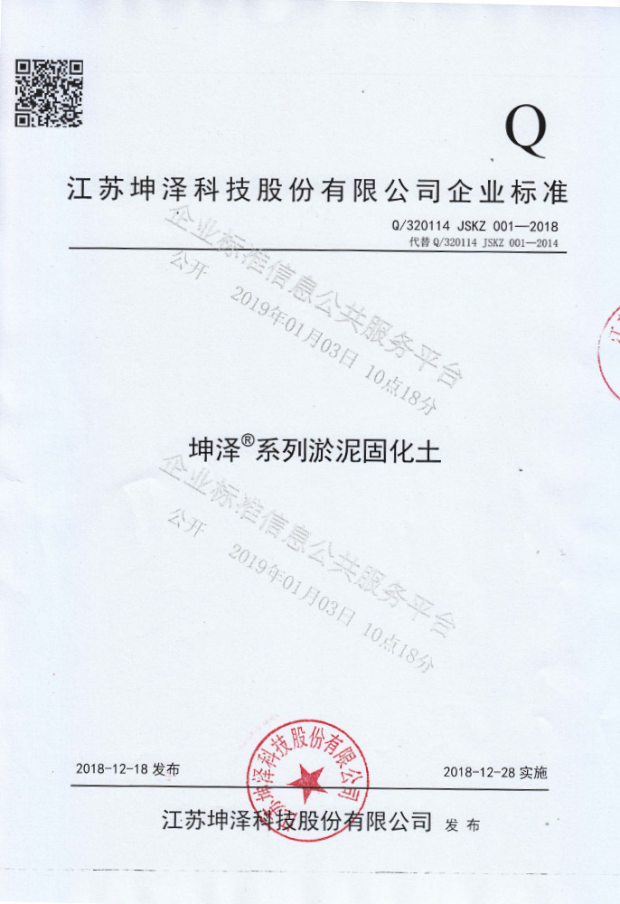 通过国家标准化机构的审核备案,建立了淤泥固化土产品的企业标准,【Q/320114 JSKZ 001-2011《坤泽®系列淤泥固化土》企业标准】(最新修订版本为Q/320114 JSKZ 001-2018《坤泽®系列淤泥固化土》),参编了《固化土道路应用技术规程》行业标准。