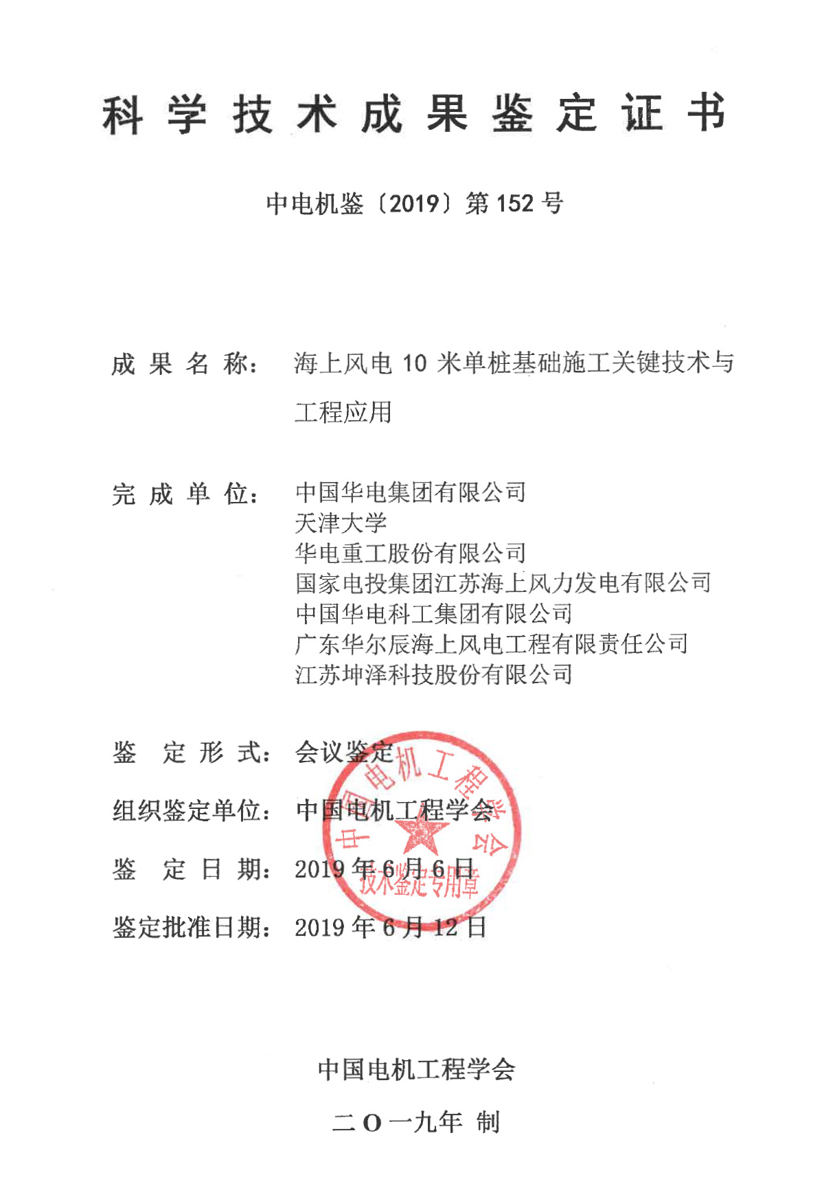 坤泽与多家单位联合申报的海上风电10米单桩基础施工关键技术与工程应用研究成果被中国电机工程学会鉴定委员会认为:”部分达到国际领先水平,总体上达到了国际先进水平。”