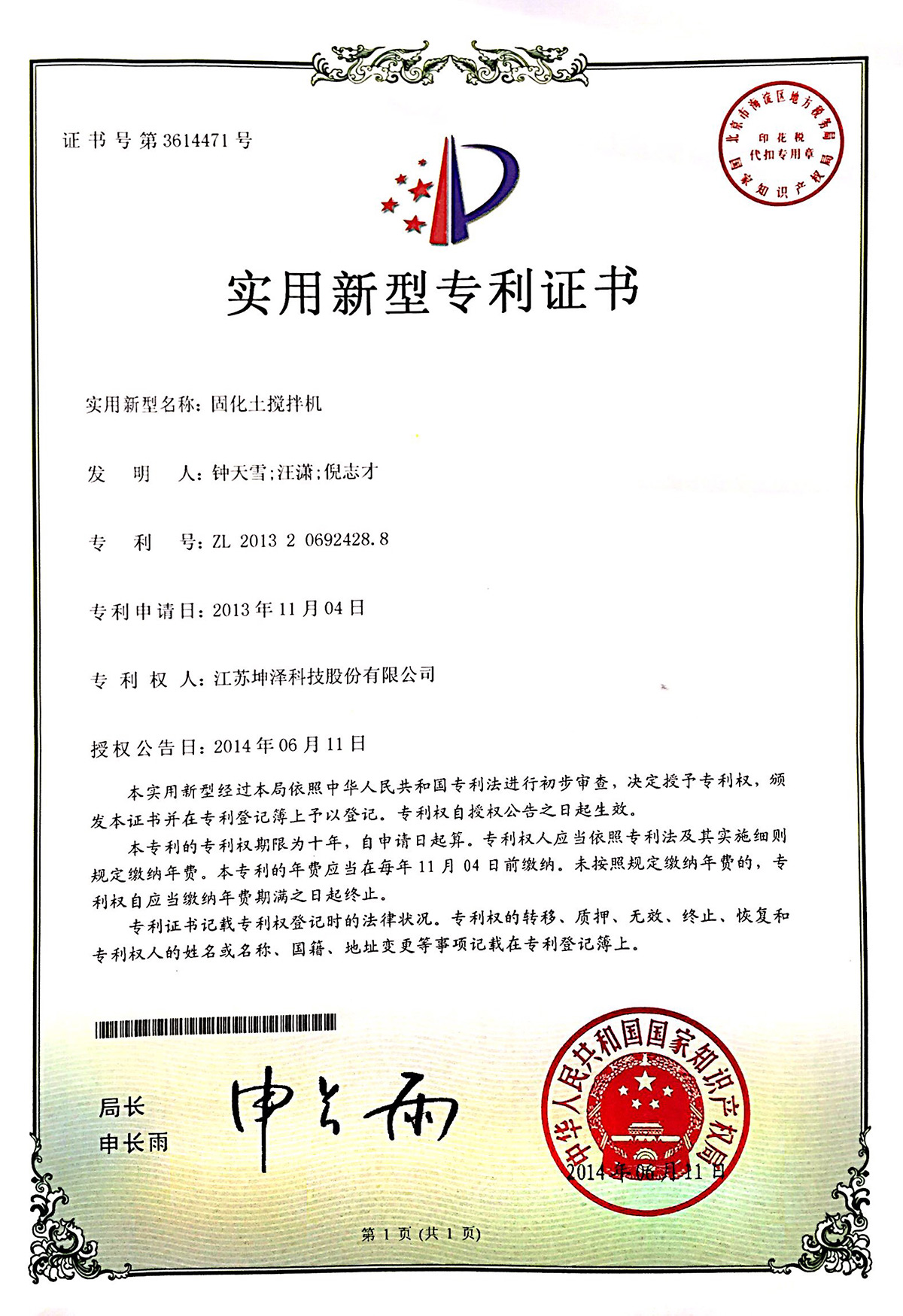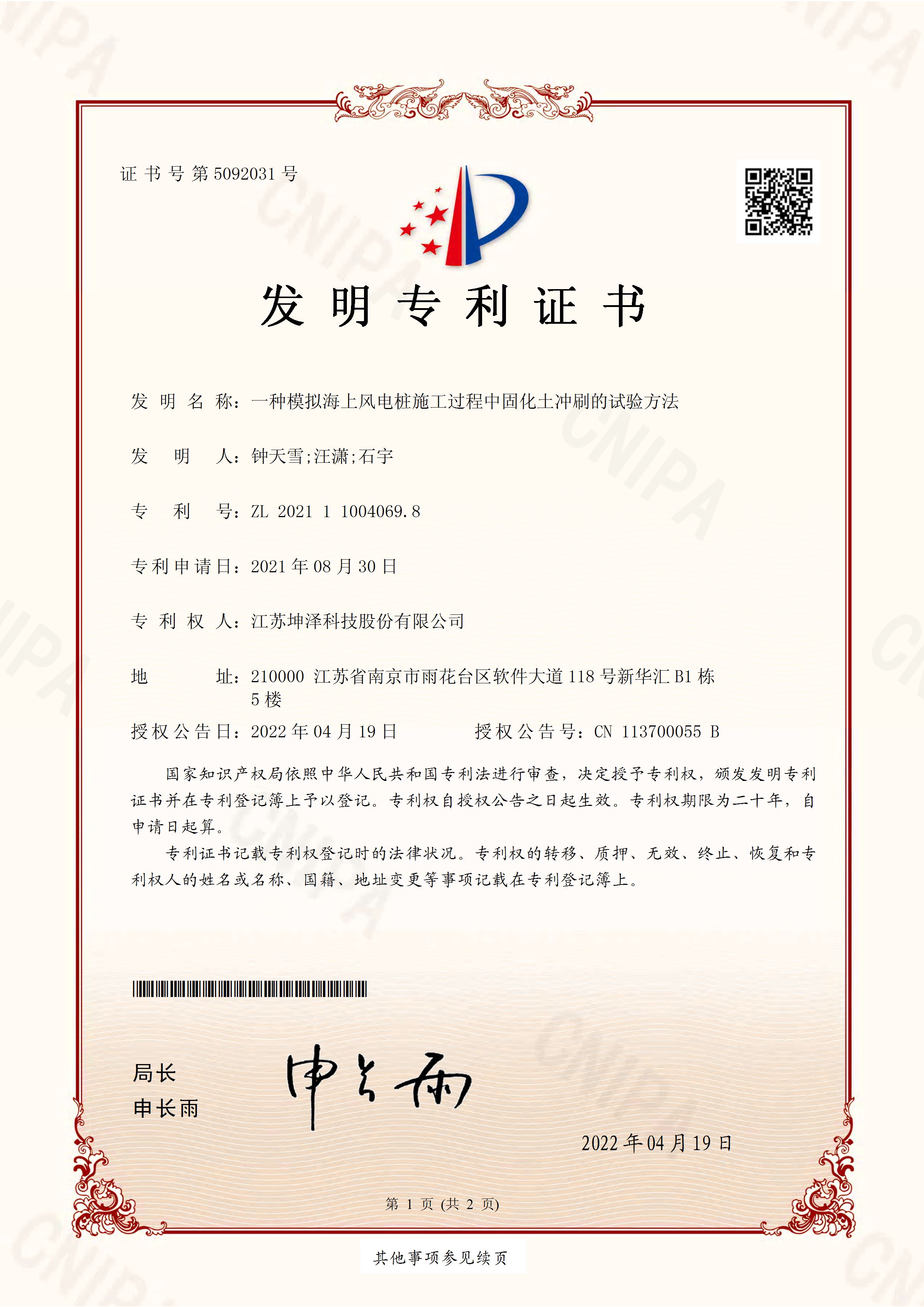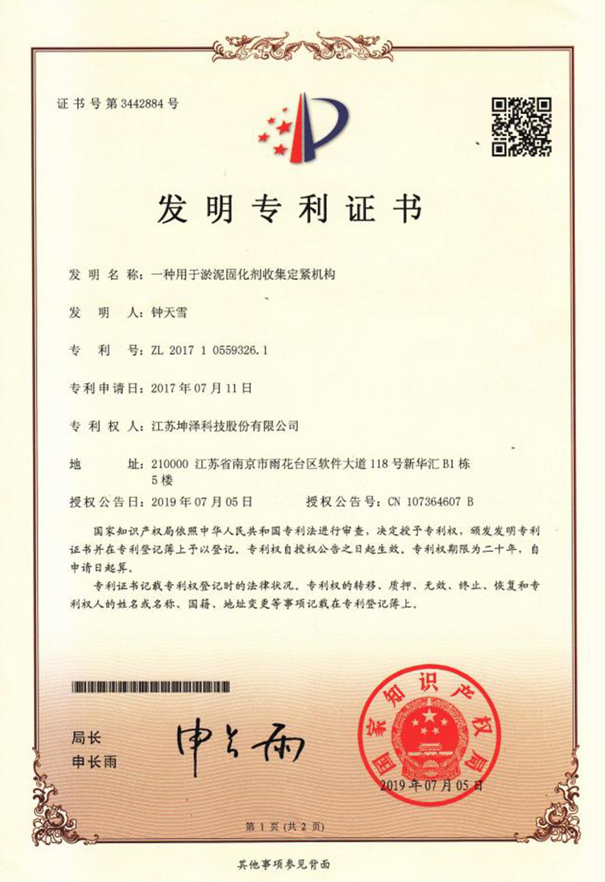 公司设有“南京(坤泽)淤泥资源化及产业化工程技术研究中心”和“连云港(坤泽)淤泥软基固化工程技术研究中心”,拥有多项专利,覆盖了固化剂、固化土产品以及施工工艺及专有生产和施工设备。