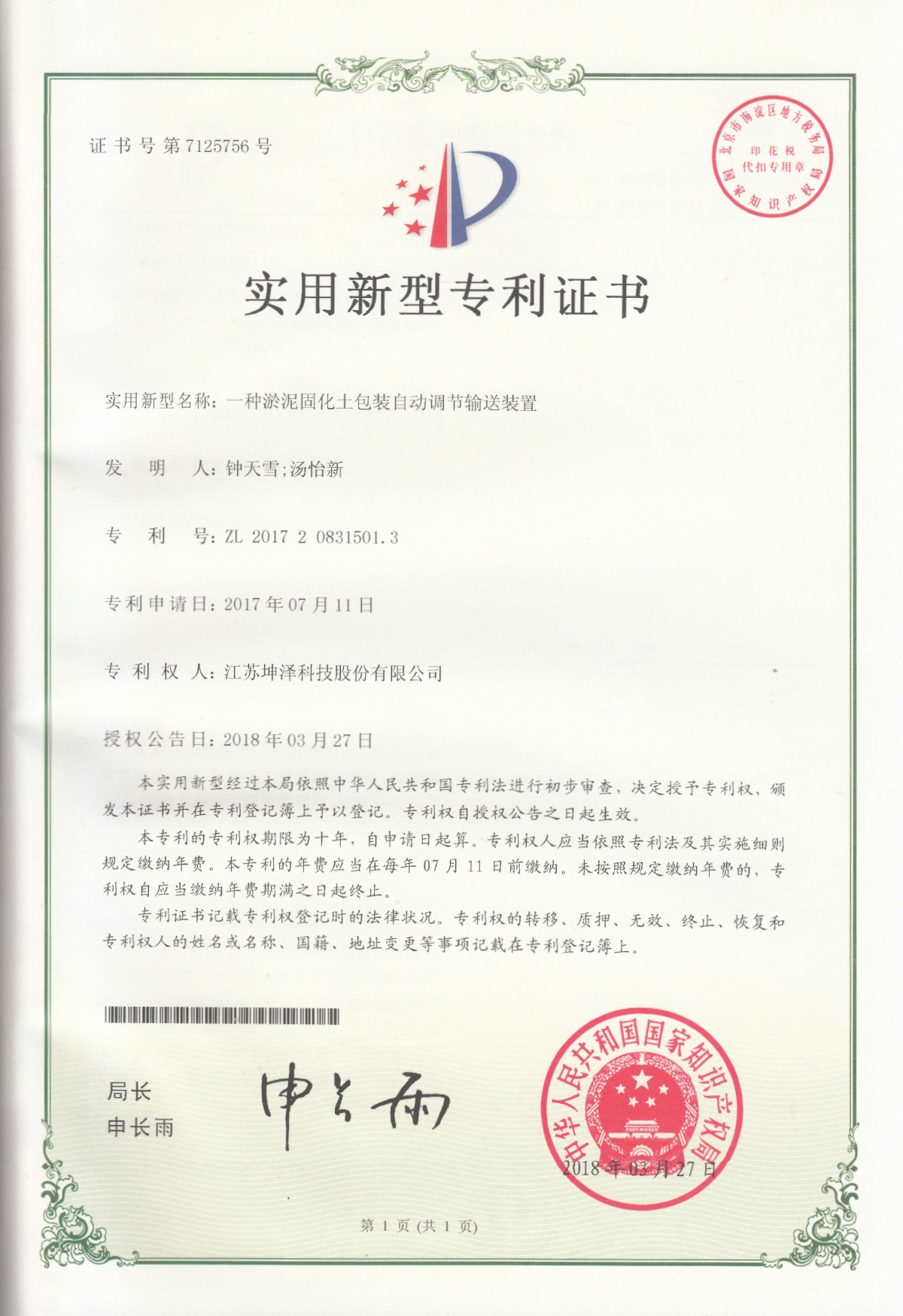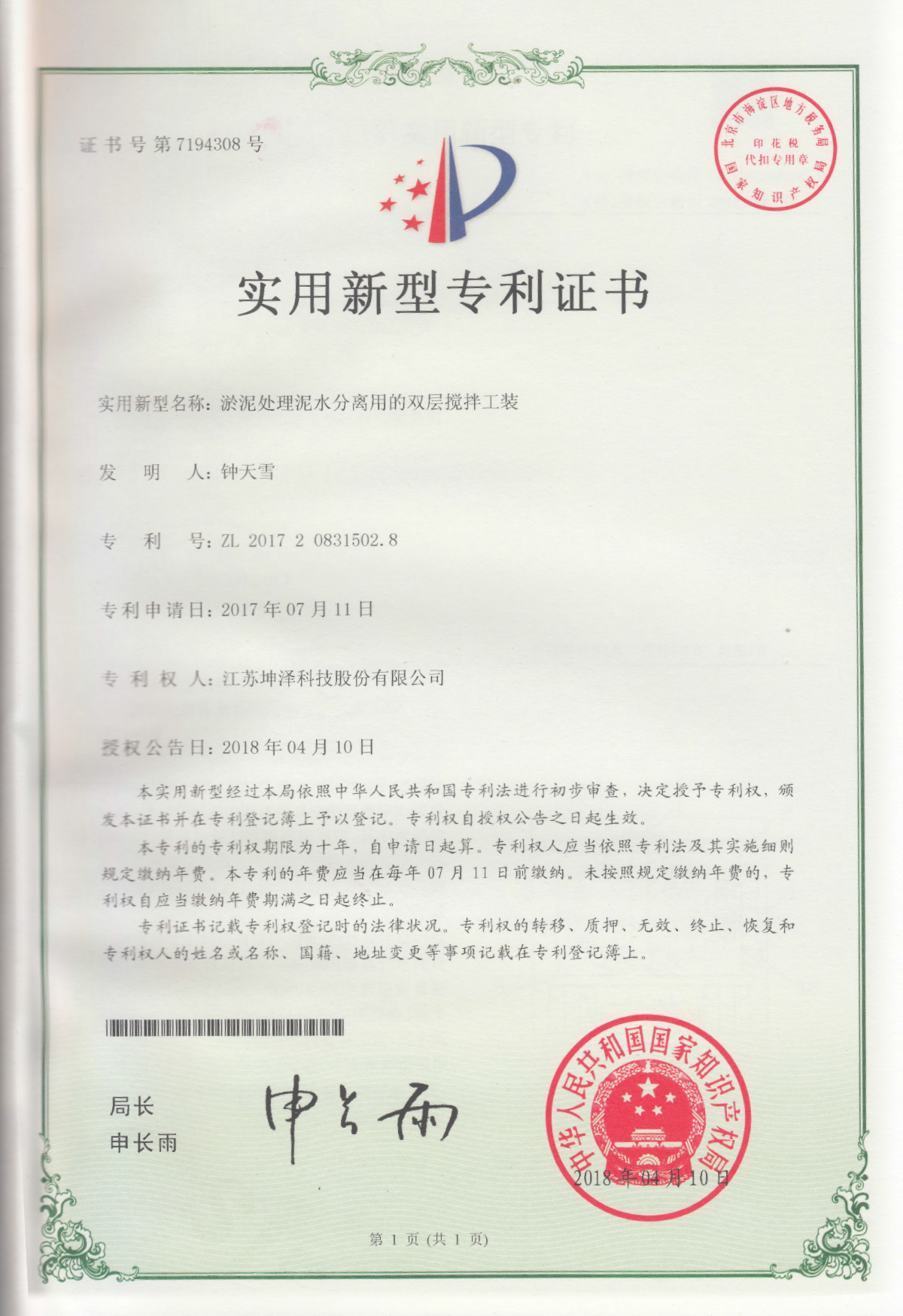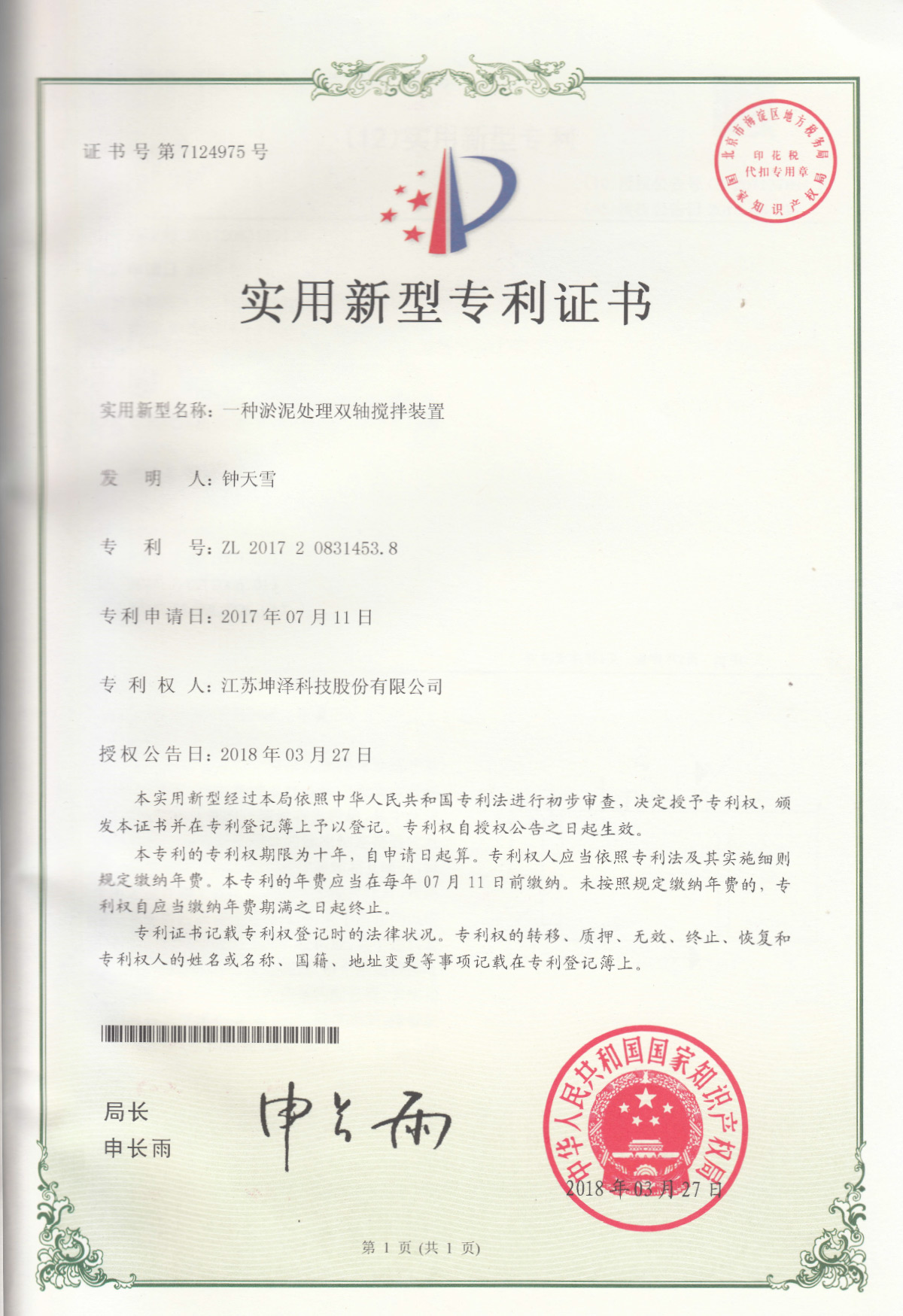 公司设有“南京(坤泽)淤泥资源化及产业化工程技术研究中心”和“连云港(坤泽)淤泥软基固化工程技术研究中心”,拥有多项专利,覆盖了固化剂、固化土产品以及施工工艺及专有生产和施工设备。